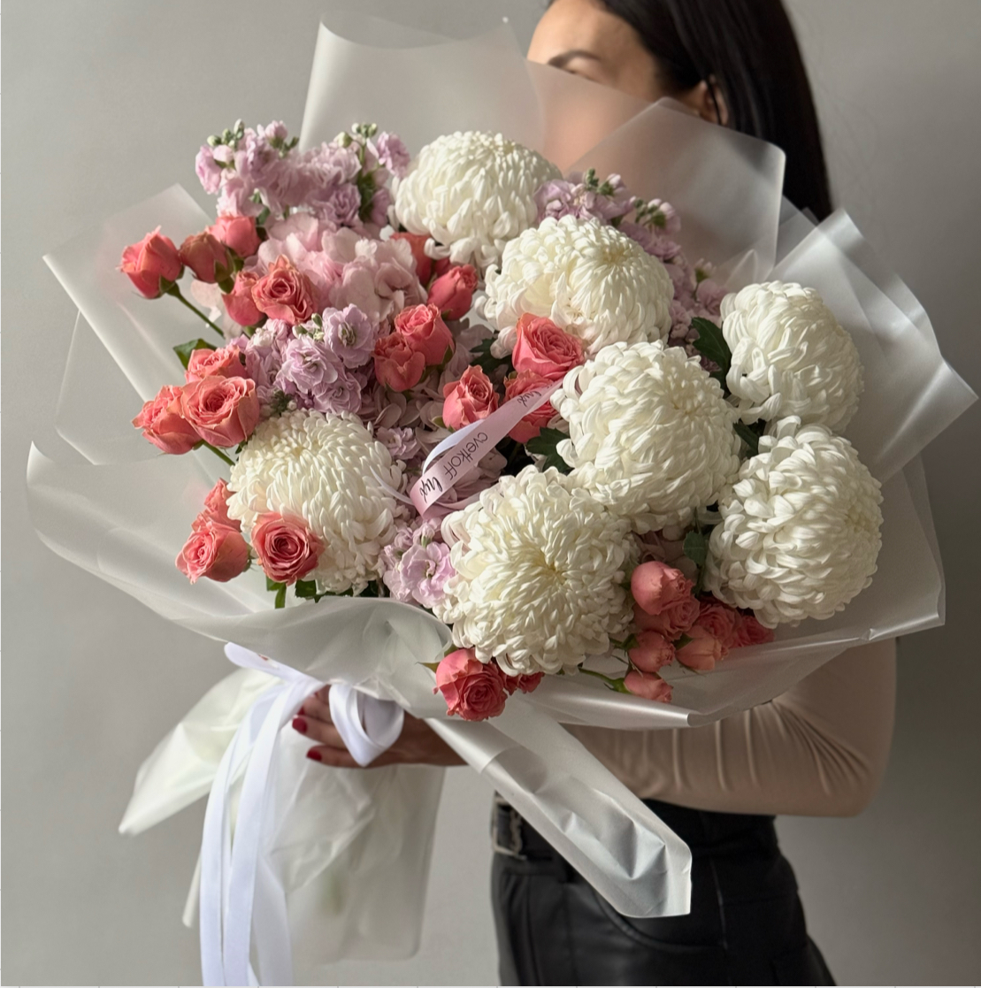 | Состав букета | 7 хризантем пушистых, 10 роз кустовых, 5 веток маттиолы, 3 гортензии, флористическая бумага, ленты |