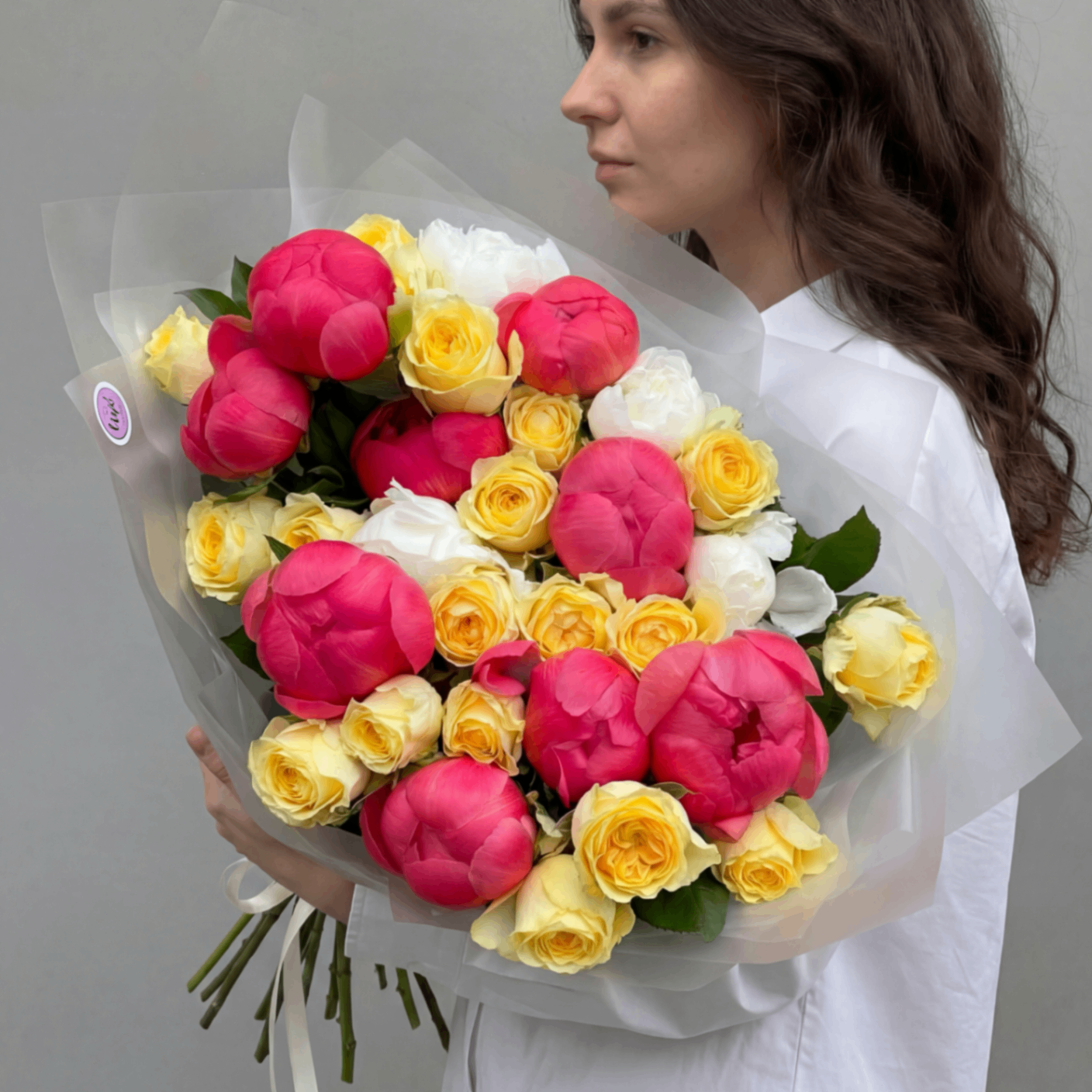 | Состав букета | 13 пионов, 20 пионовидных роз, бумага флористическая, ленты |